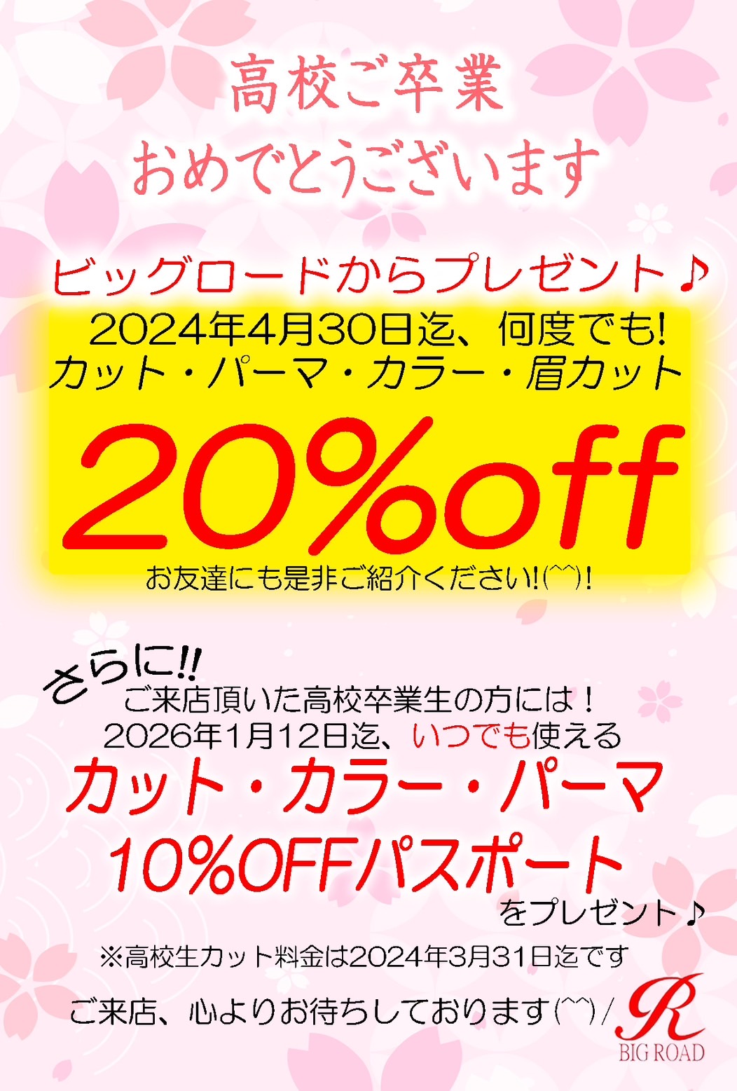 更に!!!ご来店頂いた高校卒業生の方には、2026年1月12日迄、ずっと使えるカット、カラー、パーマの10%オフパスポートをプレゼント!!