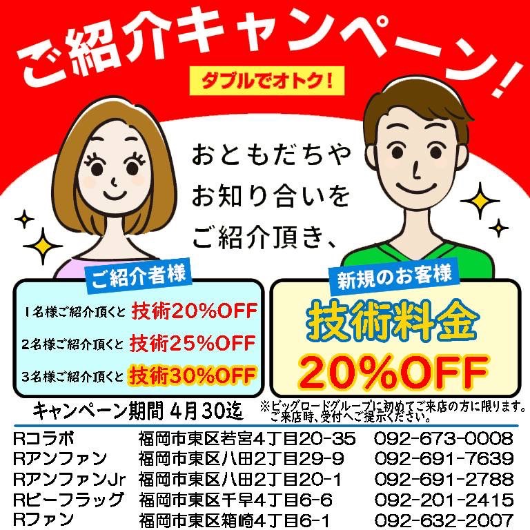 まだ、ビッグロードグループに来店したことの無いご家族、ご友人、お知り合いの方を紹介頂きますと、紹介した方・紹介された方、双方技術料金20%OFFさせて頂きます!!